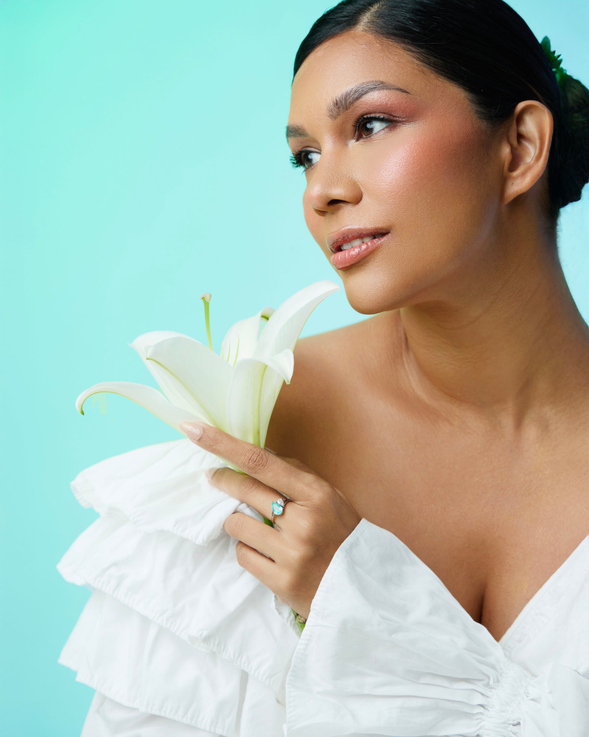 Featuring a 0.97ct Paraiba Tourmaline paired with a 0.30ct natural diamond, set in 18k white gold.