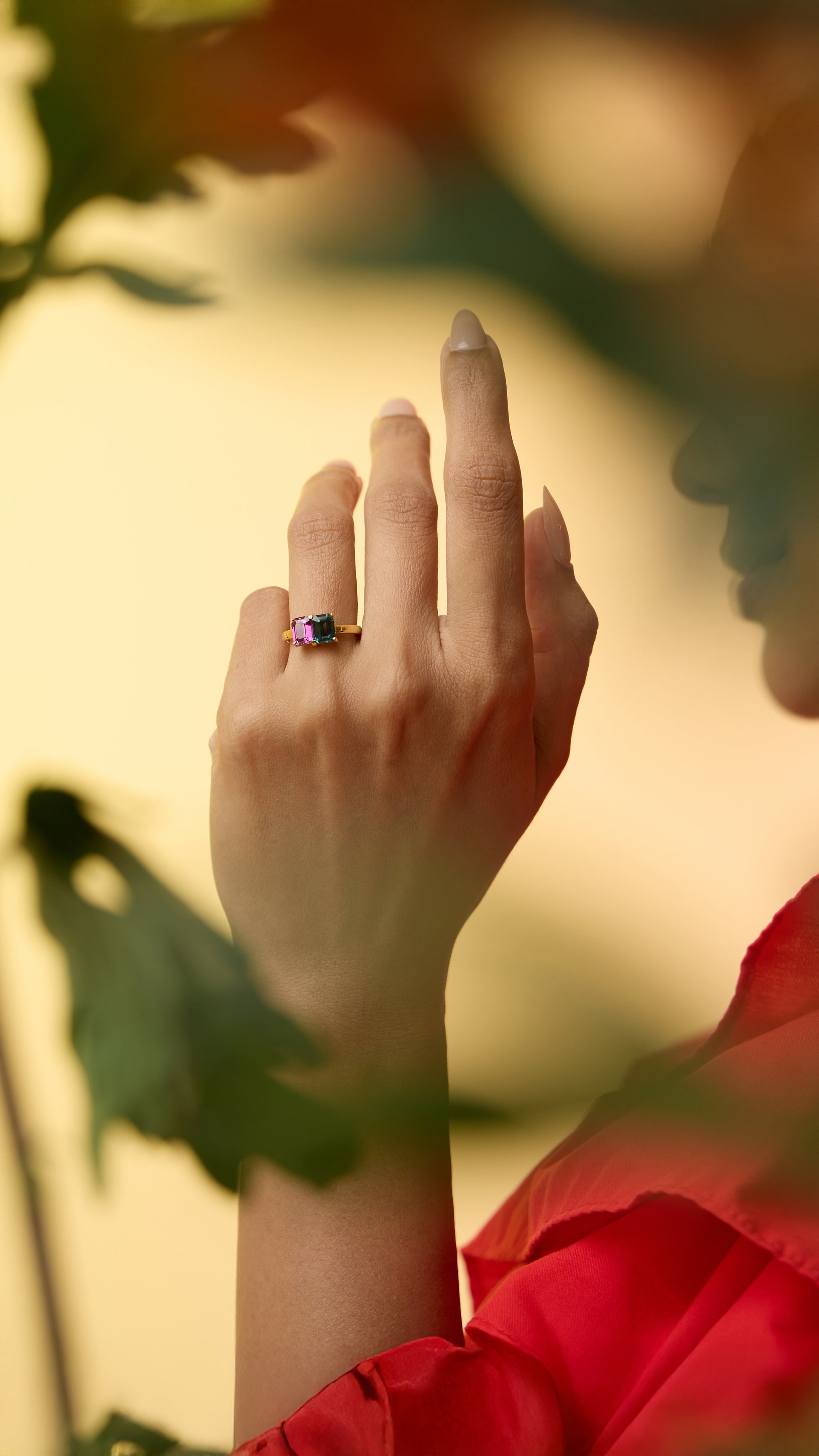 Featuring a 1.53ct heated Green Sapphire and a 1.14ct unheated Pink Sapphire, set in 18k yellow gold.